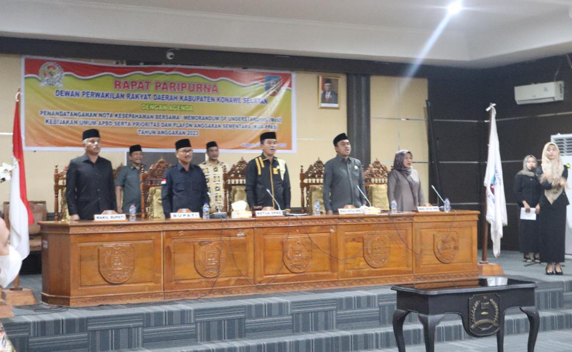 “Demikian sambutan ini pada paripurna penandatanganan Kebijakan Umum Anggaran dan Prioritas Plafon Anggaran Sementara Kabupaten Konsel tahun anggaran 2023. Harapan kita semua semoga tahapan ini dapat menjadi pedoman dalam penyusunan rancangan APBD tahun anggaran 2023,” tutupnya.