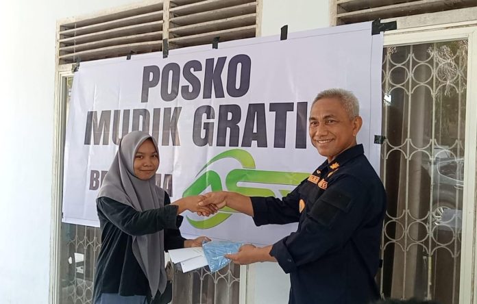 Kepala Dinas Perhubungan Provinsi Sulawesi Tenggara, Muhamad Rajulan saat menyerahkan tiket gratis kepada salah seorang pemudik di posko Mudik Gratis bersama ASR di Rujab Kadishub Sultra Laute III Kendari pada Minggu, 23 Maret 2025. Foto: Dishub Sultra