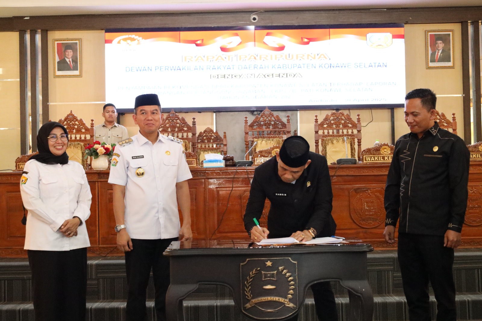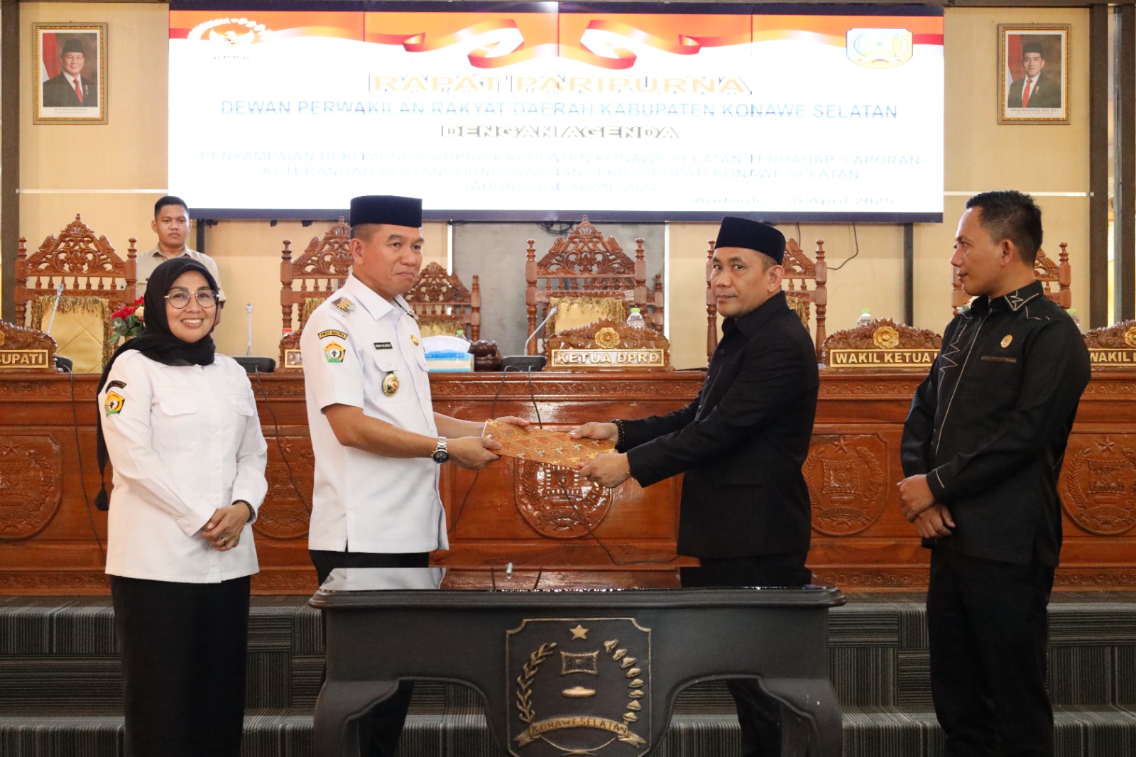 Rapat paripurna ini diakhiri dengan penyerahan secara resmi dokumen rekomendasi LKPJ dari Ketua DPRD kepada Bupati Konawe Selatan.