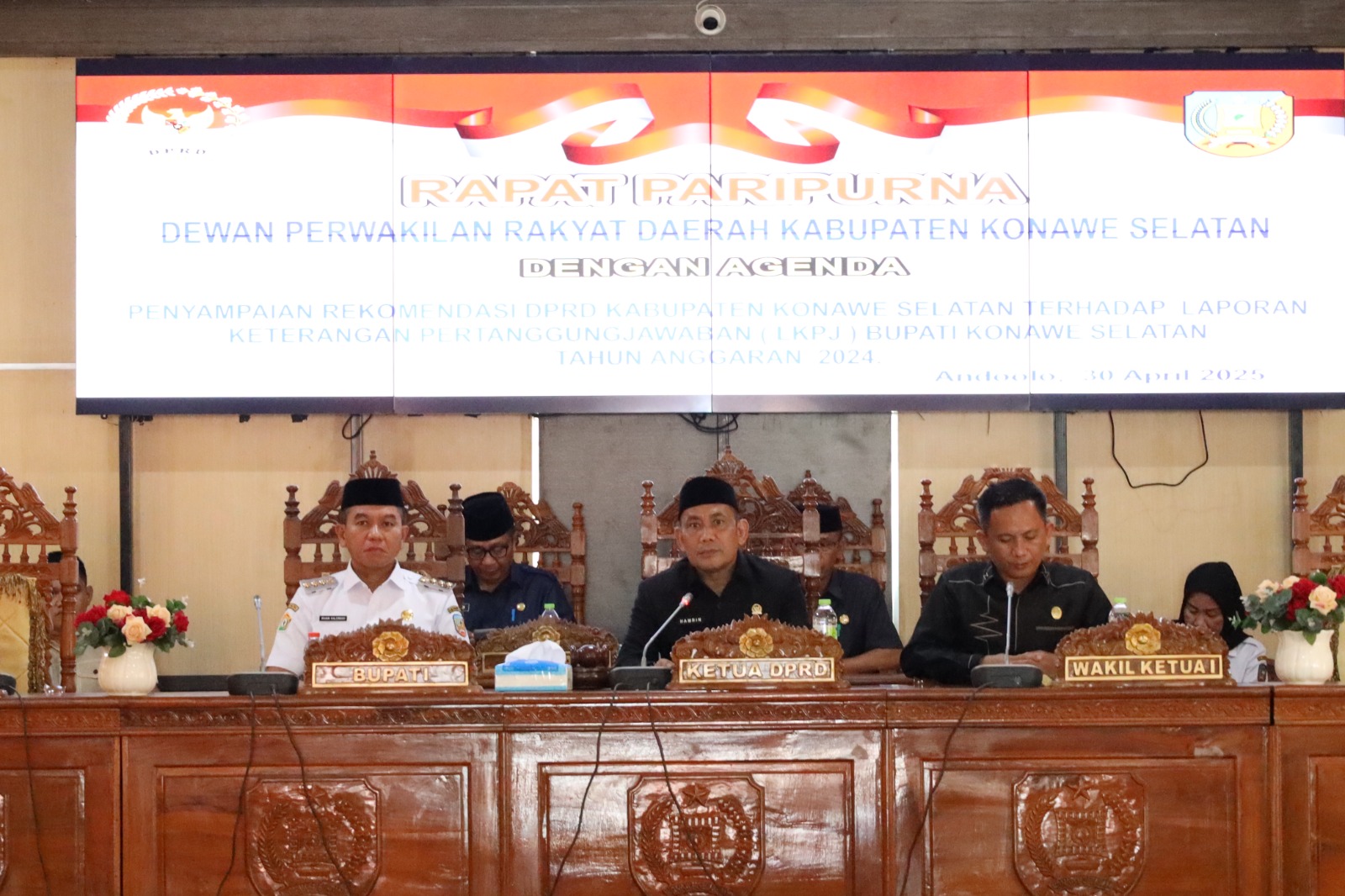 KONAWE SELATAN – LINGKARSULTRA.COM – Bupati Konawe Selatan, Irham Kalenggo menghadiri rapat paripurna Dewan Perwakilan Rakyat Daerah (DPRD) Kabupaten Konawe Selatan (Konsel) dengan agenda Penyampaian Rekomendasi Laporan Keterangan PertanggungJawaban (LKPJ) Bupati Konsel Tahun Anggaran 2024, Rabu (30/4/2025).Rapat paripurna tersebut dipimpin langsung oleh Ketua DPRD Konsel, Hamrin, didampingi Wakil Ketua I DPRD Ronald Rante Alang, serta sejumlah anggota DPRD lainnya.