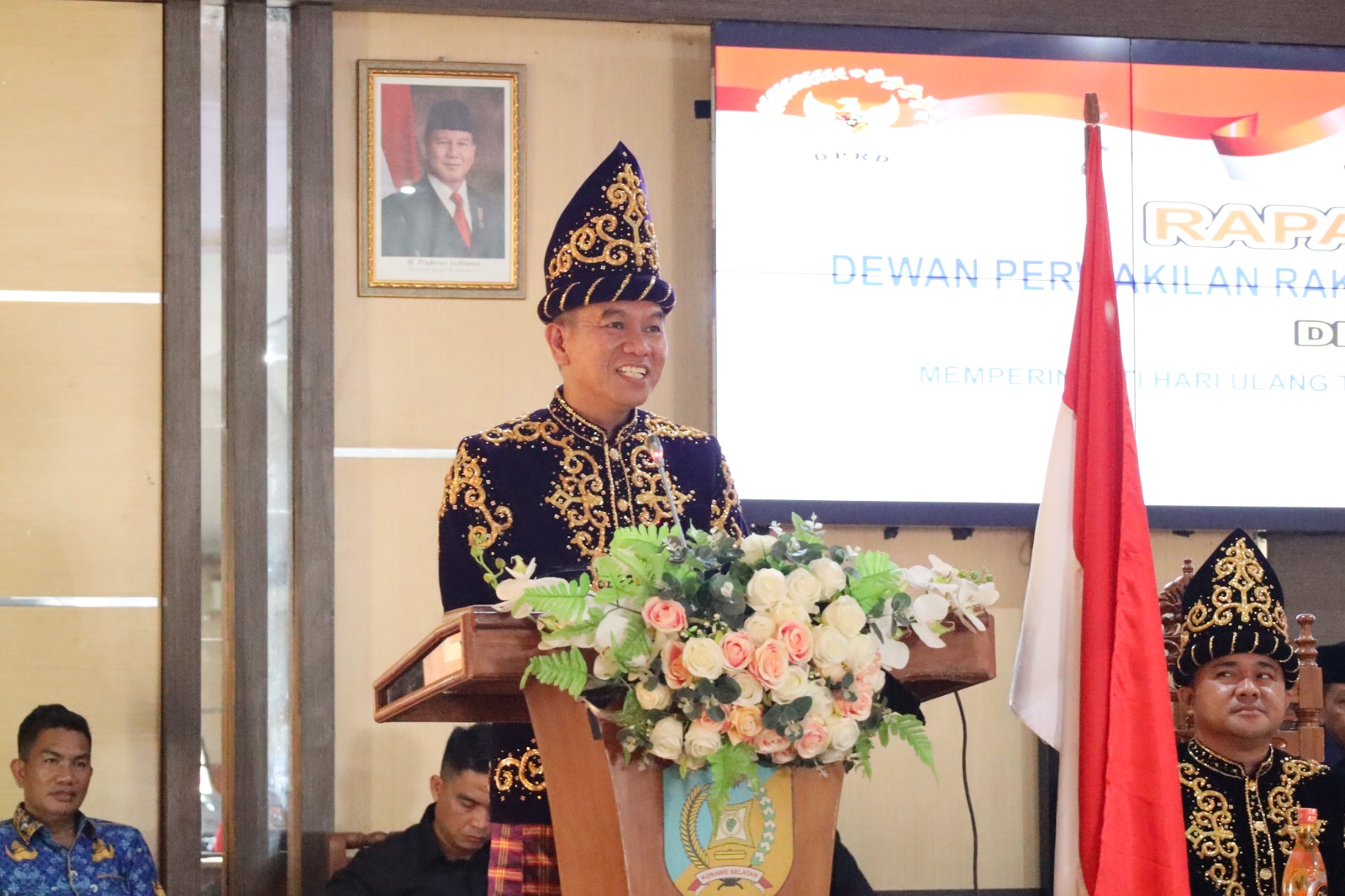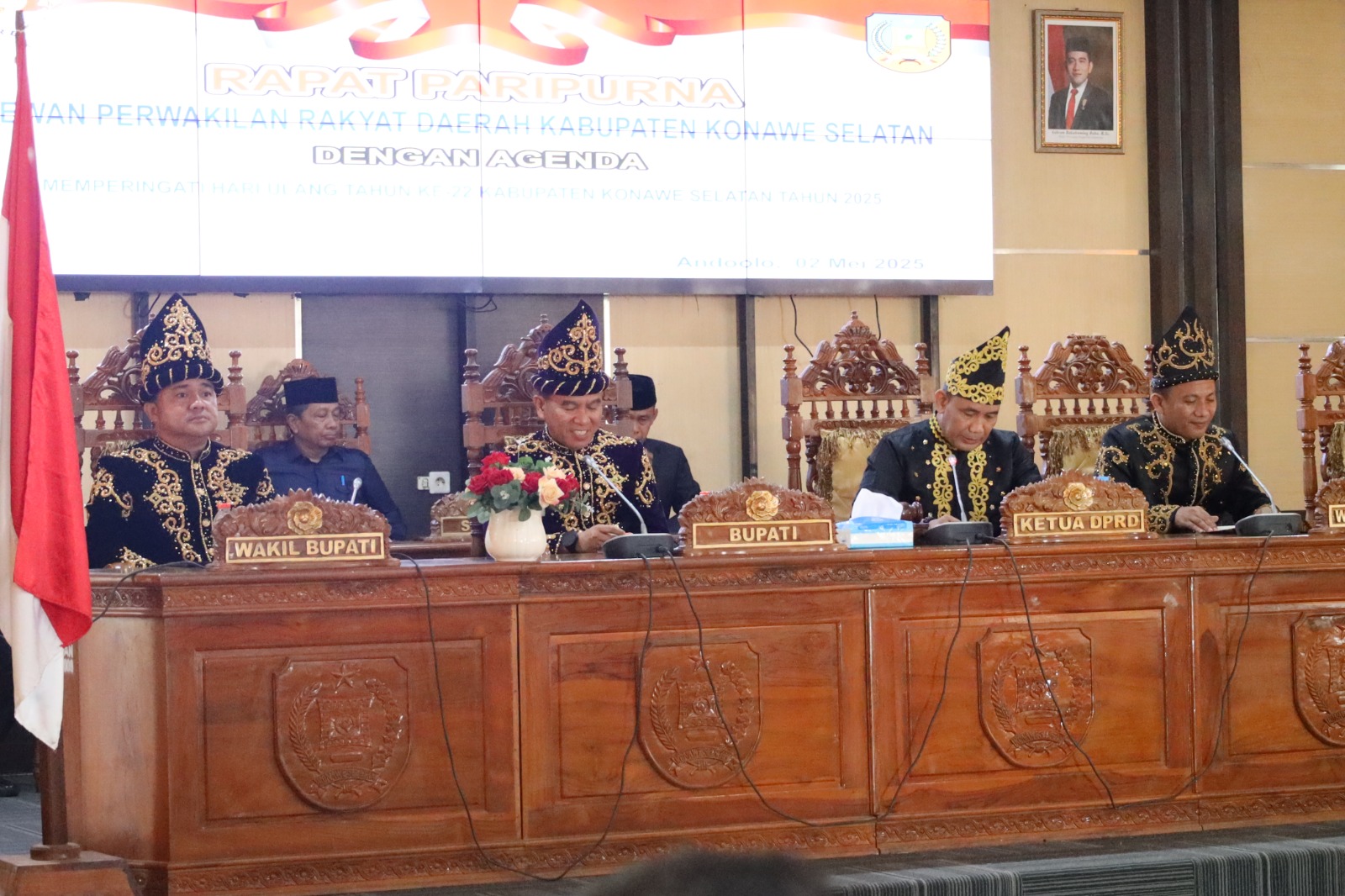 Bupati Irham Kalenggo dan Wakil Bupati Wahyu Ade Pratama turut hadir dalam Rapat Paripurna yang digelar dalam rangka memperingati Hari Ulang Tahun (HUT) ke-22 Kabupaten Konawe Selatan.Momen bersejarah ini menjadi ajang refleksi atas perjalanan panjang kabupaten berjuluk “Indonesia Mini” ini. Dengan mengusung tema “Menuju Masyarakat Sehat, Cerdas dan Sejahtera“, peringatan HUT kali ini menegaskan komitmen pemerintah daerah untuk terus meningkatkan kualitas hidup masyarakat Konawe Selatan di berbagai sektor.