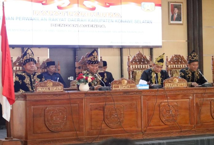 Ketua DPRD Konawe Selatan, Hamrin memimpin jalannya Paripurna, didampingi Wakil Ketua I DPRD Ronald Rante Alang, dan Wakil Ketua II Arjun serta sejumlah anggota DPRD juga dihadiri Bupati Konsel Irham Kalenggo, Wakil Bupati Wahyu Ade Pratama Imran, Sekda Sitti Chadidjah, Kapolres Konawe Selatan, Kajari Konawe Selatan dan beberapa Kepala OPD Konawe Selatan.