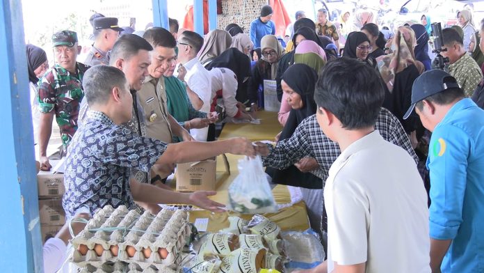 Bupati Irham Kalenggo dan Wakil Bupati Wahyu Ade Pratama Imran saat melayani masyarakat Palangga melalui Gerakan Pangan Murah, Jumat (5/9/2025). Foto: Ist