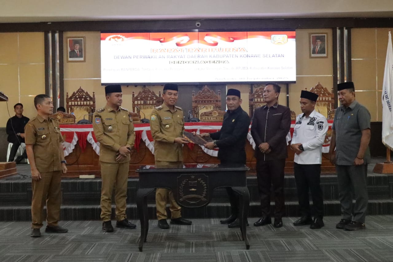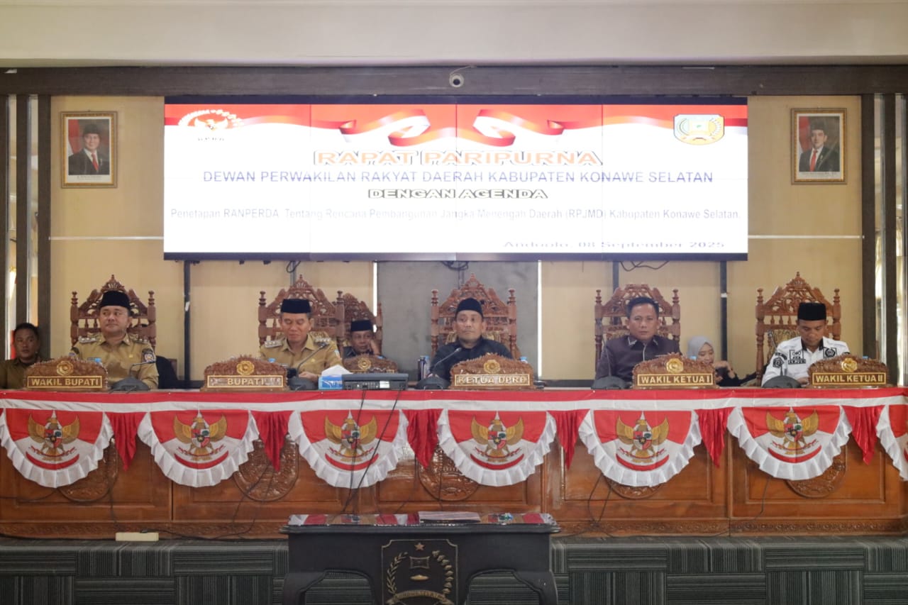 KONAWE SELATAN – LINGKARSULTRA.COM – Dewan Perwakilan Rakyat Daerah (DPRD) Kabupaten Konawe Selatan menggelar Rapat Paripurna dalam Rangka Penetapan Rancangan Peraturan Daerah Kabupaten Konawe Selatan tentang Rencana Pembangunan Jangka Menengah Daerah (RPJMD) tahun 2025 – 2029, di Aula utama DPRD, Senin (8/9/2025).