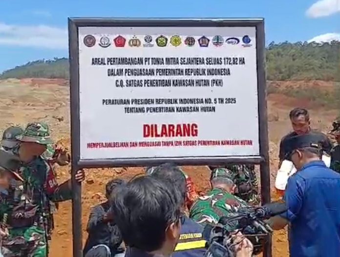 Di papan plang tersebut bertuliskan areal pertambangan PT Tonia Mitra Sejahtera seluas 172,82 hektare (Ha) dalam penguasaan Pemerintah Republik Indonesia c.q Satgas Penertiban Kawasan Hutan (PKH), berdasarkan Peraturan Republik Indonesia Nomor 5 Tahun 2025 tentang Penertiban Kawasan Hutan.