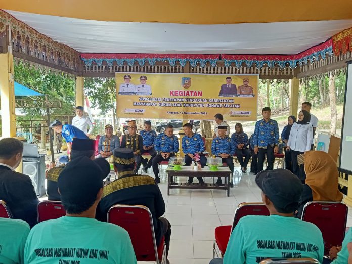 KONAWE SELATAN – LINGKARSULTRA.COM – Pemerintah Kabupaten Konawe Selatan (Konsel) mengadakan acara sosialisasi penetapan pengakuan keberadaan Masyarakat Hukum Adat (MHA) sebagai bagian dari upaya pelestarian lingkungan dan budaya lokal. Acara berlangsung di Hutan Kota Andoolo, Kelurahan Potoro, Kecamatan Andoolo, Rabu (17/9/2025).