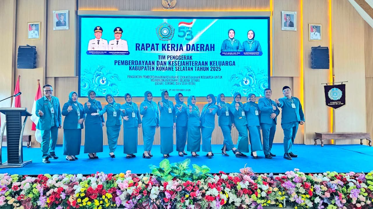 KONAWE SELATAN – LINGKARSULTRA.COM – Pemerintah Kabupaten Konawe Selatan (Konsel) bersama Tim Penggerak PKK sukses menggelar Peringatan Hari Kesatuan Gerak (HKG) PKK ke-53 dan Rapat Kerja Daerah (RAKERDA) PKK Tahun 2025, Sabtu (29/11/2025) di Auditorium Lantai 3 Kantor Bupati Konsel.